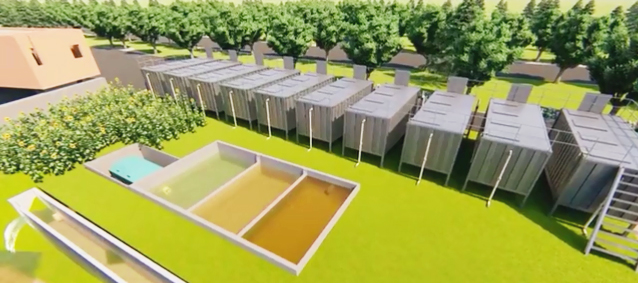 集裝箱式養(yǎng)殖系統(tǒng)采用 20 呎定制化“集裝箱”,尺寸是 6.1 米 *2.4 米 *2.8 米,養(yǎng)殖水體 25 立方米,占地面積為 15 平方米 ,配有納米增氧管(增氧)、出魚口(收魚)、集污槽(排污)、天窗(觀察投喂飼料)、固液分離器(尾水處理)等功能構(gòu)件。